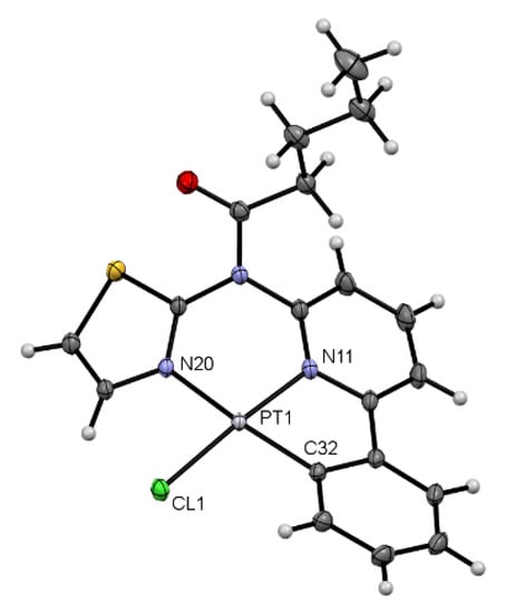 Molecular structure in the single crystal of [Pt(L6)]. Displacement ellipsoids are shown at 50% probability.