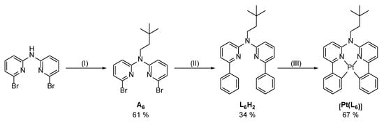 Synthetic route towards complexes with tetradentate ligands. (I) Alkylation: 1-bromo-3,3-dimethyl-butane, NaH, DMF, room temperature, 16 h, 61% yield. (II) Suzuki–Miyaura cross-coupling: phenyl-boronic acid, K2CO3, [Pd(PPh3)4], THF, H2O, reflux, 16 h, 34% yield. (III) Cyclometallation: K2[PtCl4], nBu4NCl, glacial acetic acid, reflux, 16 h, 67% yield.