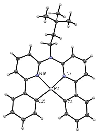 We therefore developed a synthetic approach similar to the one used for the herein-described tridentate thiazole-based compounds, but with a proper adaptation for tetradentate bis-cyclometalating ligand precursors. In this way, the Buchwald–Hartwig cross-coupling is avoided while giving access to alkyl-substitution on the bridging nitrogen atom. The di(bromo-pyridine)amine precursor is known from the literature [,] and can be modified as in the case of A5. The alkylation can be achieved by following the procedure reported in the literature, using an alkylbromide and NaH in DMF at room temperature, thus yielding A6 []. The second step again involves a Suzuki–Miyaura cross-coupling towards the tetradentate ligand precursor L6H2. Unfortunately, the incomplete conversion leads to a product mixture of the di-substituted L6H2 and the mono-substituted L6BrH species. This explains the relatively low yields; nonetheless, the remaining bromine atom could represent a versatile intermediate where a second functionalization step could provide an asymmetric tetradentate chelator with interesting photophysical properties []. In the final step, the cyclometalation yielded the complex [Pt(L6)]; due to the double cyclometalation, the reaction time needs to be adjusted to ensure a reasonable yield (from 16 h to 48 h; the synthesis is summarized in Figure 5). From pure DCM, we were able to obtain suitable crystals for X-ray diffractometry (the molecular structure in the crystal is shown in Figure 6; more details can be found in the Supplementary Materials, see Figure S114 and Table S4). The crystal structure shows a packing resembling [PtCl(L2)], as both crystalize in a P21/c space group, forming head-to-tail-dimers where the 3D packing results from interactions between the π systems and the hydrogen atoms.