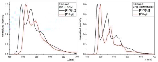 Selected normalized photoluminescence spectra (λexc ≈ 370 nm) for [PtCl(L5)] (black) and [Pt(L6)] (red). Measured in Ar-purged fluid DCM at 298 K (left) or in frozen glassy matrices (DCM/MeOH 1:1) at 77 K (right).