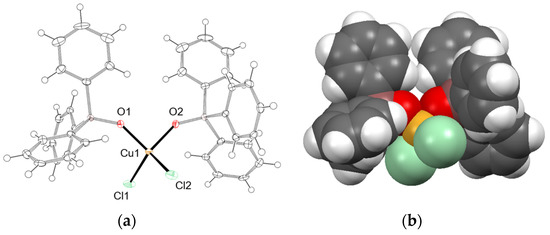(a) Molecular structure of 2a. Thermal ellipsoids set at 50%; (b) space-filling model of 2a. Chosen bond distances: Cu1-O1: 1.9627(19) Å, Cu1-O2: 1.9711(19) Å, Cu1-Cl1: 2.1827(8) Å, Cu1-Cl2: 2.1870(8) Å.