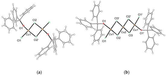 We characterized the compounds prepared via IR spectroscopy, melting points, elemental analysis, and, if possible, X-ray diffraction analysis (see Supplementary Materials). Even though only few IR data have been reported to date [25,43,44], IR spectroscopy is a suitable method for the differentiation of the compounds named above. In general, all compounds show similar vibration bands; however, they can be differentiated by the characteristic νCuII4O, νCuI4Cl4, νC-P, and νP-O in the IR spectra. Compounds 1, 2, and 3 display characteristic vibrations of the metal core at 540 cm−1, 572 cm−1, and 542 cm−1, respectively, whereby the values for 1 and 2 correspond well to those described in the literature (see Supplementary Materials Figure S15) [4,17,18,25]. In the free TPPO ligand, νC-P (542 cm−1) is blue-shifted in comparison to the free TPP ligand (513 cm−1). Hence, νC-P of the TPPO-containing compounds 2 (536 cm−1) and 2a (544 cm−1) falls into the range of the metal core vibrations of 1 and 3 (see Supplementary Materials, Figure S16). However, the confusion of these bands, and hence compounds, can be excluded by comparison with the range 1300 cm−1–1050 cm−1, where only the TPPO-containing compounds 2 and 2a show the characteristic νP-O (2: 1198 cm−1, 2a: 1143 cm−1, free TPPO: 1190 cm−1, see Supplementary Materials, Figure S17). Furthermore, 1, 2, and 3 show 3 characteristic absorption bands for δC-Harom. (out of plane) in the range 775 cm−1–650 cm−1, whereas 1a–1c only show 2 characteristic bands (see Supplementary Materials, Figure S18). Again, the TPPO-containing compounds 2 and 2a as well as free TPPO show three absorption bands (see Supplementary Materials, Figure S19); thus, a clear differentiation of 1, 1a–1c, 2, 2a, and 3 based on IR spectroscopy alone is only possible via the appearance/absence of νP-O.