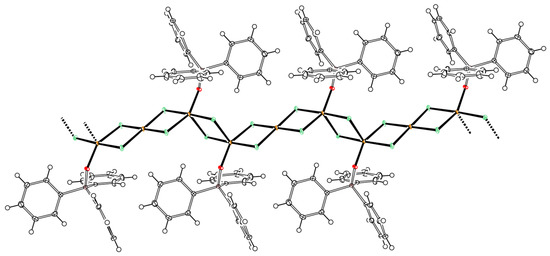 Compound 2b forms individual complex units that pack in a 1:1 ratio with molecules of 2a in the crystal structure. Both Cu(II) centers show a distorted square-planar coordination geometry, which also is observed for 2a; however, in 2a, the distortion is much more pronounced, as indicated by the τ4 value of 0.59, which even suggests a rather distorted tetrahedral geometry [33]. In 2b, the τ4 value is 0.36 and, thus, much closer to the ideal square-planar geometry (τ4 = 0) than to a tetrahedron (τ4 = 1). As a consequence of the dinuclearity of 2b, the Cu-Cl bond distances in the central {Cu2Cl2} diamond are elongated by appr. 3.6% in comparison to the terminal Cu-Cl bond distances. The latter are comparable to the Cu-Cl bond distances in 2a. Additionally, the Cu-O bonds in 2b are shorter by appr. 2.8% than in 2a. In contrast to 2a and 2b, 2c forms zigzag-like chains, in which the [{CuIICl2}3(TPPO)2] units are linked via the terminal copper centers of the {Cu3Cl6} units (Figure 5). As a result, the terminal Cu(II) centers display a trigonal-bipyramidal coordination geometry with two Cl− anions and the oxygen atom of TPPO in the equatorial plane. The central Cu(II) center shows a square-planar geometry and lies in the same plane as the other two Cu(II) centers. In general, copper(II) halides are known to form chain-like structures with repeating {CuX2} units; e.g., for CuCl2 and CuBr2, researchers involved in this study have previously reported similar compounds with CH3CN instead of TPPO as ligands [15,16].