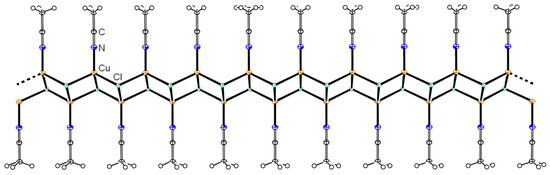 To complete our investigations, we repeated the synthetic experiment with TPP instead of TPPO. Thus, instead of mixing CuO and CuCl2 with TPPO, we added TPP and heated the suspension in dry methanol to reflux for 3 h. After filtration and removal of the solvent from the filtrate, a green-colored solid (1-crude) was obtained. Recrystallization of 1-crude from acetone yielded 2a as the main product. The formation of 2a can be explained by the redox reaction of the redox pairs Cu(II)/Cu(I) and TPP/TPPO; however, the origin of oxygen is not certain. It is known that traces of H2O in dry solvents leads to the oxidation of TPP to TPPO [17], but at the same time, CuO could have been the oxidant and origin of the oxygen atom. In accordance with the oxidation of TPP to TPPO, the reduction of Cu(II) to Cu(I) was observed: Additionally to 2a, colorless crystals of CuCl and the new compound CuCl·CH3CN (Figure 6) were found in the sample. In contrast to pure CuCl, CuCl·CH3CN crystallized as a zigzag ladder structure of {Cu2Cl2} diamonds, in which the copper(I) ions are coordinated by three chloride ions. The additional CH3CN ligand completes the tetrahedral coordination geometry. The Cu-Cl bond distances are 2.390(6) Å and thus, slightly elongated in comparison to those of pure CuCl (d(Cu-Cl): 2.339(6) Å). The structure is isostructural with the previously reported structure of CuBr·CH3CN [15]. Interestingly, similar structures containing TPP or triethylphosphine (PEt3) are known; however, [{CuIBr}4(TPP)4], [{CuII}4(TPP)4], and [{CuIBr}4(PEt3)4] are described as tetramers with a step configuration and not as coordination polymer [18,34,35,36]. A similar ladder-like structure with phosphine is only known for tetraphosphine ligands that yield octanuclear complexes with CuX (X = Cl, Br, I) [37].