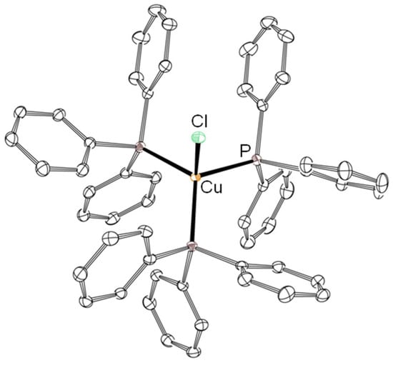 Even though our reaction setup differed, the results mainly agree with those described by Makáňová et al. The already described trend that an excess of TPP reduces Cu(II) to Cu(I) could be confirmed, as well [17,18]. When CuCl2·2H2O was added in excess (Table 1, entry 1), red crystals of 2 occurred as the main product. Additionally, small amounts of [CuICl(TPP)] (1a) were obtained as gray precipitate. When using equimolar amounts of CuCl2·2H2O and TPP (Table 1, entry 2), 1a was obtained as the main product. In contrast, when using a slight excess of TPP (Table 1, entry 3), a colorless solid precipitated that was identified as [CuICl(TPP)2] (1b) formed. When the amount of TPP was further increased (Table 1, entry 4), [CuICl(TPP)3] (1c) was obtained as colorless precipitate. The remaining filtrate was left for crystallization. Via diethyl ether diffusion, colorless crystals of 1c could be obtained that were suitable for X-ray diffraction analysis (Figure 7). As known from previous analysis [38,39], the Cu(I) center displays a tetrahedral coordination geometry. Co-crystallization of 1c occurs with acetone solvent molecules, whose presence corresponds to the traces of acetone in the IR spectrum (see Supplementary Materials) and minor deviations of the elemental analysis (see Supplementary Materials). In general, minor deviations in the elemental analysis results of 1a–1c are caused by remaining solvent molecules.