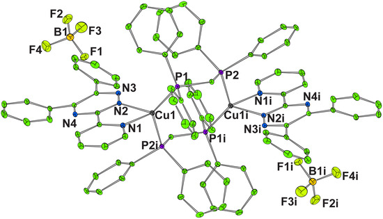 3.1. Crystal Structure of [{Cu(L)}2(μ-dppm)2](BF4)2