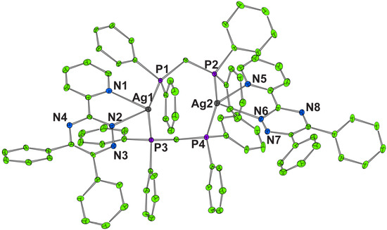 3.2. Crystal Structure of [{Ag(L)}2(μ-dppm)2] (NO3)2 1.5(H2O)