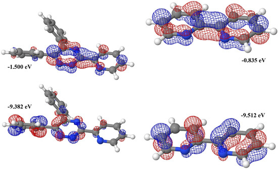 Frontier molecular orbital energies calculated by MOPAC for the ligand used (left) and for bipiridine (right).