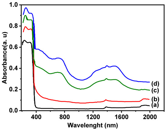 Diffuse reflection UV–visible–NIR spectroscopy offers valuable insights into the oxidation state of transition metals, their coordination and the symmetry of their surrounding environment. Co/TiO2 absorption spectra in the UV–visible–NIR are displayed in Figure 5. It should be noted that distinguishing between different species is challenging for two distinct considerations: (i) In the 1100–1500 nm wavelength range, the v1 transition of octahedral ions partially overlaps with the v2 transition of tetrahedral species. In addition, the high coefficient of absorption of the tetrahedral species makes it difficult to detect the first transition. (ii) In TiO2, a Co2+ → Ti4+ charge transfer can take place. Indeed, an absorption of Co2+-modified MgTi2O5 in the 400–500 nm wavelength region was assigned to this transition mode [12,33]. It is important to consider Co2+ to Ti4+ charge transfers, since cations of the active phase and support have variable valence. The UV spectrum of TiO2 shows strong absorption related to the interband transition, and maxima around 320 and 220 nm are attributed to Co2+ to Ti4+ charge transfers. The 3.8 wt% Co sample has slight absorption in the visible range (Figure 5); however, for the 7.5 and 15 wt% Co samples, new bands appear and intensify with increasing Co load. The near-infrared (NIR) region has a broad band in the 1200 and 1600 nm interval, as well as the band of 2″(OH) harmonics of residual hydroxyl groups, which is located close to 1380 nm. The visible range has another band around 700 nm, and a shoulder with a maximum at 420 nm in the range of 400 and 600 nm observed only in the loaded 15 wt% Co sample (Figure 5, curve d). These results indicate the presence of different cobalt species [12].