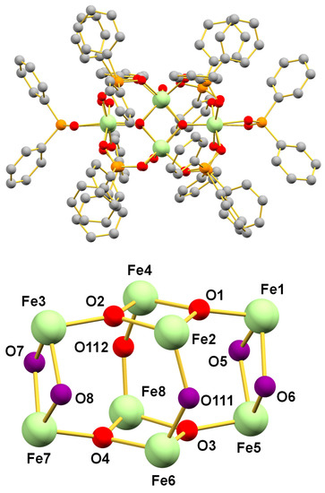 Complex 1 crystallizes in the orthorhombic space group Pbca with the asymmetric unit containing the complete Fe8 anion. The structure of the latter and its labeled core are shown in Figure 1; a stereopair is provided in Figure S1 (Supplementary Materials). The core consists of two {Fe4(µ3-O)2}8+ butterfly units, common structural units in Fe4 cluster chemistry [28,92,93,94,95,96,97,98,99,100], stacked on top of each other and bridged by one O2− and five HO− ions. The octahedral FeIII oxidation states (Table S1, Supplementary Materials) and the protonation level of core O atoms (Table 2) were confirmed by Fe and O bond valence sum (BVS) calculations, respectively [74,75]; BVS values for all core and ligand O atoms are listed in Table S2. The BVS of O2− ion O112 is 1.55, lower than expected because it is involved in a hydrogen-bond with the NHEt3+ cation (O112···H-N = 2.807(3)Å), akin to a ‘partial-protonation’. Peripheral ligation about the {Fe8O5(OH)5}9+ core is provided by ten η1:η1:μ2-PhPO2− groups, and the complete cation has virtual D2h symmetry, ignoring the disorder and rotation positions of the Ph rings.