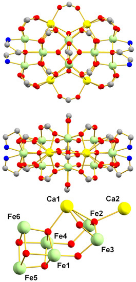 - Burger, J.; Klüfers, P. Stabilization of Iron Clusters by Polyolato Ligands and Calcium Ions: An Fe14 Oxocluster from Aqueous Alkaline Solution. Angew. Chem. Int. Ed. 1997, 36, 776–779. [Google Scholar] [CrossRef]