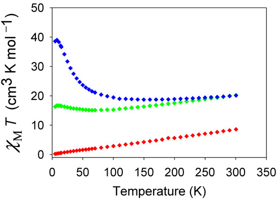 Infrared spectra in the 400–4000 cm−1 range were recorded in the solid state (KBr pellets) using a Nicolet iS5 FTIR spectrometer. Elemental analyses (C, H, and N) were performed by Atlantic Microlabs in Norcross, GA, USA. Metal oxidation states were determined from bond valence sum (BVS) calculations [74,75]. Variable temperature dc and ac magnetic susceptibility data were collected on vacuum-dried samples using a Quantum Design MPMS-XL superconducting quantum interference device (SQUID) magnetometer, capable of operating with applied dc fields up to 7 T. Microcrystalline samples were restrained in solid eicosane to prevent torquing. Dc magnetic susceptibility data were collected under a constant 0.1 T applied field in the 5.0–300 K temperature range. Ac magnetic susceptibility studies were performed using a 3.5 G applied ac field in frequencies up to 1000 Hz and in the 1.8–15 K range. Pascal’s constants were used to estimate the diamagnetic correction, and eicosane and gel capsule contributions were measured as a blank. These values were subtracted from the experimental susceptibility to provide the molar paramagnetic susceptibility (χM) [76].