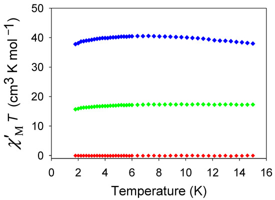 To remove the possibility of any complicating effect of the dc field on the lowest T data, especially when studying complexes with some very weak couplings, alternating current (ac) magnetic susceptibility studies were carried out in the 1.8–15.0 K range using a 3.5 G ac field at a 1000 Hz oscillation frequency, and with no applied dc field. The obtained ac in-phase (χ′M) susceptibility of the three complexes is plotted as χ′MT vs. T in Figure 6. For 1·½MeCN, χ′MT is essentially zero below 15.0 K, confirming a well-isolated S = 0 ground state spin as deduced from the dc data. For 2·H2O, χ′MT is essentially constant below 15.0 K at ~17.0 cm3 K mol−1, in agreement with the dc data suggesting four non-interacting Fe3+ ions. For 3·4H2O, we were very interested to see that χ′MT agreed with the dc χMT data, with a plateau value at 6–10 K of ~40.5 cm3 K mol−1, confirming that the surprisingly high value is not an artifact of the dc field.