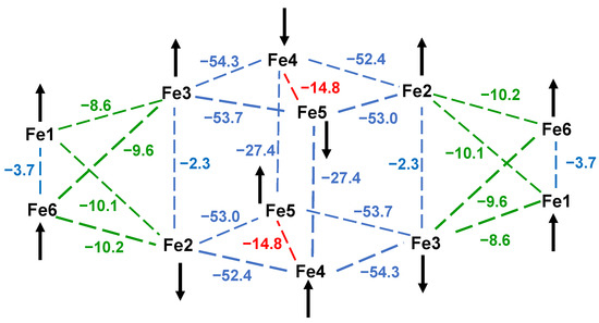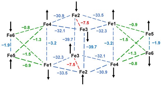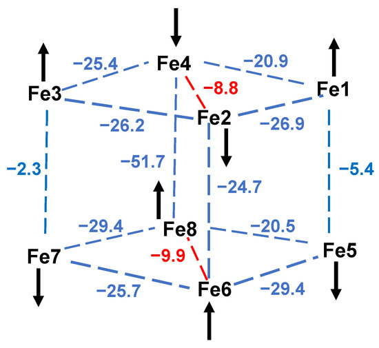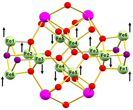 Elucidating the magnetic properties of the Fe8 anion of 1 is also important in allowing interpretation of the magnetic properties of the larger Fe12 cores of 2 and 3 that contain an Fe8 sub-unit. The JMSC for the anion of 1 separates into three groups: weak, strong, and very strong. Within each Fe4 butterfly, the body-body (Jbb) interactions (Fe2Fe4 and Fe6Fe8) are weak (−8.8 and −9.9 cm−1, respectively), as expected for bis-monoatomically bridged Fe2 pairs with their smaller Fe-O-Fe angles (<100°) [13,39,51,102]. In contrast, the wingtip-body (Jwb) interactions within each butterfly are strong (−20.9 to −29.4 cm−1), reflecting their single monoatomic bridge and consequently larger angles (127–132°). Since each butterfly unit comprises two edge-fused Fe3 triangles and all the intra-butterfly interactions are AF, there will be spin frustration effects operating (competing exchange interactions). However, within each Fe3 triangle, the one weak Jbb is competing with two strong Jwb so the former is completely frustrated and the Jwb are satisfied, i.e., the spin vector alignments are determined only by the Jwb (Figure 7). There are four inter-butterfly interactions, two of which (Fe1Fe5 and Fe3Fe7) are again weak (−5.4 and −2.3 cm−1, respectively) due to being bis-monoatomically bridged. The third is Fe2(μ2-OH)Fe6 and is strong (−24.7 cm−1), whereas the fourth is Fe4(μ2-O)Fe8 and is very strong (−51.7 cm−1), the difference assignable to the latter’s shorter Fe-O bonds (av. 1.855 Å) compared with the former’s Fe-OH bonds (av. 1.936 Å) since the Fe-O-Fe angles are similar (138.63 vs. 134.75°, respectively). The inter-butterfly interactions are not competing with each other nor the intra-butterfly ones, and they are therefore all satisfied, even the weakest ones. This provides the overall spin vector alignments shown in Figure 7, rationalizing the experimentally observed S = 0 ground state.