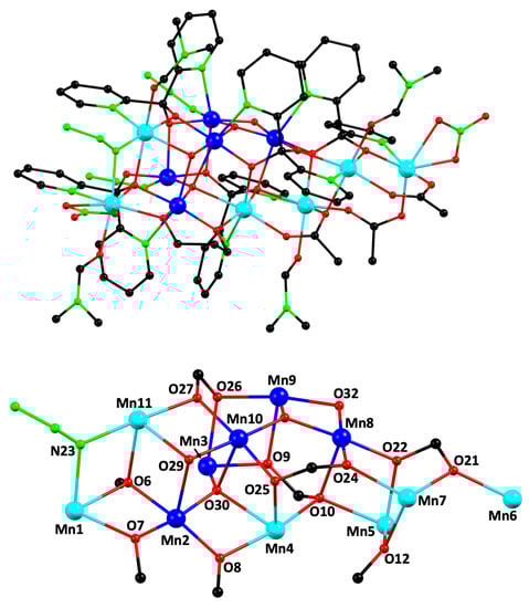 Figure 4. Ball and stick representations of (top) the complete structure and (bottom) the partially-labelled core of 5. H atoms are omitted for clarity. Colour code: MnII, cyan; MnIII, blue; N, green; O, red; C, black.