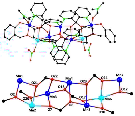 Polynuclear coordination complexes of paramagnetic 3d metal ions have become the focus of intense investigation over the last few decades since they often possess interesting physical properties and fascinating structural features [1,2,3,4,5]. Among other 3d metals, manganese-containing compounds have been of great interest due to the ability of Mn ions to adopt a variety of oxidation states (i.e., II, III, and IV) and form high nuclearity metal-oxo clusters that can find applications in different research fields, including bioinorganic chemistry [6,7,8,9], materials science [10,11,12], and molecular magnetism [13,14,15]. In the latter case, Mn clusters hold a special place since they often possess a large number of unpaired electrons, and, in the presence of ferromagnetic exchange interactions, they can act as high spin molecules and/or magnetic refrigerants [16,17,18]. In addition, the combination of high spin ground state values (S) with significant uniaxial magnetic anisotropy (D), which in the case of Mn compounds is usually the result of Jahn–Teller (JT) axial elongation of MnIII ions in octahedral environments, can lead to single-molecule magnetism (SMM) behaviour [19,20,21]. SMMs are discrete species that can exhibit the properties of bulk magnets, but at the molecular level. Thus, SMMs display slow magnetic relaxation below a characteristic blocking temperature (TB) due to a significant energy barrier (Ueff) to reversal of the magnetization vector [22]. However, reorientation of magnetization cannot occur only by overcoming the Ueff barrier, but also through the barrier via quantum tunnelling of the magnetization (QTM) [23]. As a result of the coexistence of classical and quantum natures in such individual molecules, SMMs have been proposed for a variety of potential applications including high-density memory storage devices [24,25], quantum computing [23,26,27,28], and spintronics [29,30,31,32].
