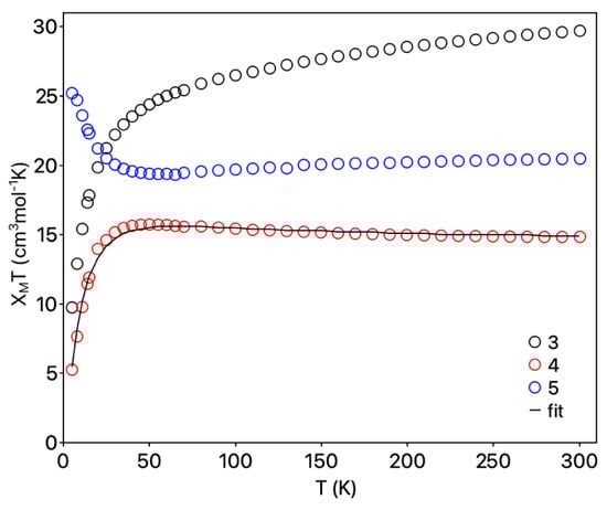 Figure 5. Temperature dependence of χMT for complexes 3, 4, and 5 in a field of 0.1 T. The solid black line represents the fit of the experimental data obtained for complex 4.