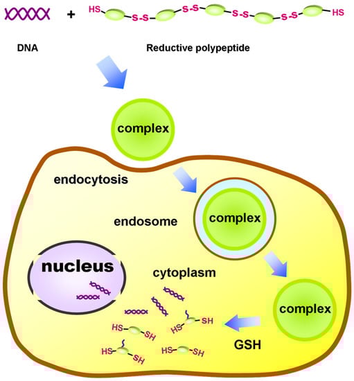 A common issue faced by polycation vectors is how to strike a balance between toxicity and transfection efficiency. The introduction of a reduction-responsive group into the carrier by molecular design is a viable strategy, such as using a disulfide-crosslinked carrier [59,60,61]. The disulfide bonds can be cleaved in the highly reducing environment in cells, which contributes to the release of nucleic acid molecules into the cytoplasm. As an example, Zhang et al. constructed a PEGlated reductive vector by oxidativly polycondensing CHK6HC-mPEG and CHK6HC, both of which contained the short chain of lysine segments, via disulfide bonds (Figure 2) [62]. The disulfide bonds in the resultant nanovectors were reductively degraded into short-chain oligopolylysine in an intracellular environment, and the cytotoxicity was greatly reduced by such reducible polycations. Moreover, the transfection efficiency of PolyHK6H-mPEG was comparable to that of PEI-mPEG, but its toxicity was much lower than that of PEI-mPEG.