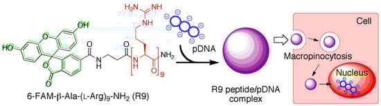 Schematic of the synthesis of 6-FAM-labled R9/pDNA complex for gene delivery. Adapted with permission from the authors of [70].