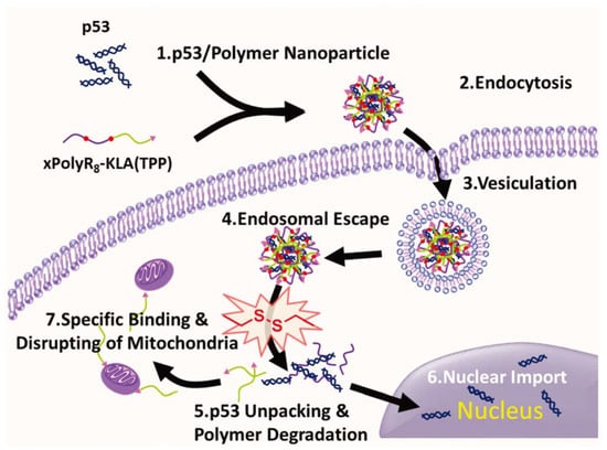 Schematic of the construction of dual-functional polypeptide (xPolyR8-KLA(TPP)) via disulfide crosslinking approach for highly efficient p53 delivery. Adapted with permission from the authors of [104].