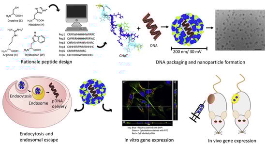 Peptides have been regarded as perfect building blocks for non-viral vectors owing to their unique advantages, such as good biocompatibility, functional diversity (such as membrane permeability, targeting, and endosome escape), biodegradability, and ease of synthesis and modification [21,22]. Short cationic peptides can be used alone or as fusion proteins to bond and condense appropriate DNA, resulting in the formation of gene-loaded peptide-included complexes with prospective functionalities for targeted cell internalization and efficient intracellular transfection [23,24,25]. To date, various peptide-based gene delivery systems, such as virus-mimicking peptide particles, hybrid peptide systems assisted by lipids or polymers, and polypeptide nanostructures, have been constructed for the purpose of organelle targeting, molecular imaging, and anticancer therapy [26,27,28]. In this review, we will highlight the significance of peptide-based gene delivery systems as potential therapeutic nanomedicine for the treatment of diseases.
