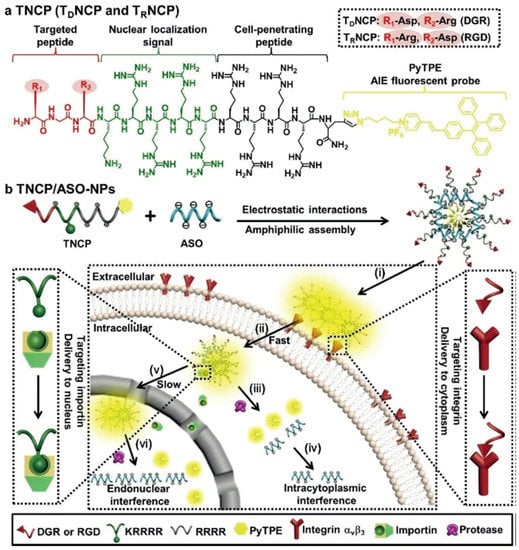 Recently, Xia et al. reported the design of a versatile gene-delivery strategy for the sequential delivery of an antisense single-stranded DNA oligonucleotide (ASO) in a targeted cell nucleus (Figure 8) [136]. Specifically, a multidomain designer vector, TNCP, was fabricated via the integration of a targeted peptide, NLS peptide, CPP, and an AIE fluorescent probe (PyTPE) to generate the multifunctional vector with distinct properties, including integrin targeting, cell permeability, nuclear import, as well as real-time tracking. Comparted with the delivery of siRNA that functions in the cytoplasm, the resultant TNCP/ASO complex showed effective gene transcription in a much higher efficient manner, demonstrating the nucleus-targeting delivery. In addition to the nucleocytoplasmic trafficking property, such a design provides a valuable theranostic platform for successful oligonucleotide-based therapies in further clinical applications.