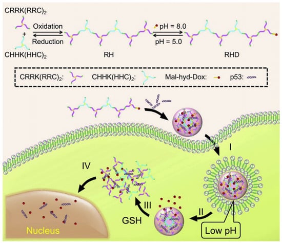 In addition, Zhang et al. combined CPP with NLS and synthesized the peptide sequence of TAT-PKKKRKV for the gene therapy of limb ischemia disease [140]. Both in vivo and in vitro experiments demonstrated that TAT-PKKKRKV was a highly efficient and low-toxic gene delivery vector, which could effectively promote the expression of the protein in the ischemic hind limbs of rats, thereby improving the ability of local angiogenesis. In order to solve the barriers faced by non-viral vectors in gene delivery, such as cell membrane penetration and endosome escape and entry into the nucleus, Liu et al. designed a series of multifunctional cationic peptides for gene delivery by combining CPP(TAT), endosome escape α-helix peptide (LLKK)3, and stearic acid through the sulfhydryl crosslinking of cysteine [141]. Two of them showed a low toxicity and high transfection efficiency. Among them, C18-C(LLKK)3C-TAT was used to compress and transport PGL-3 plasmid, and the efficiency of luciferase expression was equivalent to that of commercial liposome Lipofectamine 2000 in 293T cells and NIH-3T3 cells. In another work, Zhang et al. fabricated a highly branched and reducible polypeptide (RH), which was synthesized via the oxidation-induced crosslinking of two three-armed peptides (i.e., (CRR)2KRRC and (CHH)2KHHC), to obtain a dual-responsive gene/drug co-delivery system (Figure 9) [142]. Specifically, the antitumor drug DOX was covalently conjugated with the highly branched polypeptide RH via pH-sensitive hydrazone bonds, resulting in the formation of RHD, which were subsequently complexed with p53. The resultant RHD/p53 nanosystem could efficiently transport DOX and p53 to tumor cells and possess the ability of endosome escape owing to the protonation by (CHH)2KHHC. The pH-triggered DOX release and GSH-triggered p53 release showed a much-enhanced effect in tumor cell killing, representing their great potential for synergetic tumor treatment with a much-reduced dose of chemotherapeutic drugs.