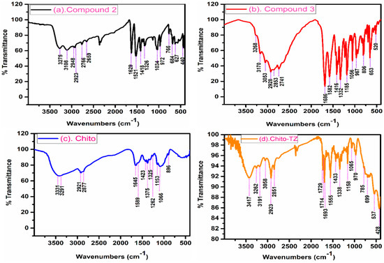 FT-IR spectra of (a) compound 2, (b) compound 3, (c) Chito, and (d) Chito-TZ.