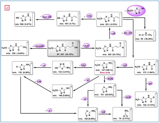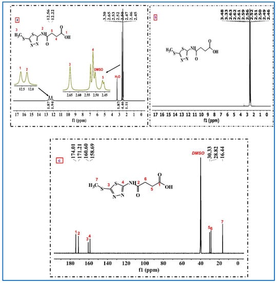 The NMR spectra of compound 3 are revealed in Figure 2. In Figure 2a, the 1H NMR signals at 0 ppm, 2.5 ppm, and 3.3 ppm correspond to the signals of tetramethylsilane (TMS), residual non-deuterated dimethyl sulfoxide (DMSO), and residual H2O in the sample, respectively. The characteristic singlet signals at 12.56 ppm and 12.22 ppm (exchangeable with D2O-DMSO in Figure 2b) were attributed to -OH and amidic -NH protons, respectively. Also, a singlet signal at 2.65 ppm referred to the three protons of the methyl thiol (SCH3) group and showed triplet signals at 2.52 ppm and 2.46 ppm representing the protons of the methylene groups (-CH2-CH2-). On the other hand, the 13C NMR analysis (126MHz, DMSO-d6, Figure 2c) revealed the carbon of the carbonyl groups of (-COOH) and -NH-CO- at 174.01 ppm and 171.21 ppm, respectively. The thiadiazole ring’s carbons were detected at 160.60 ppm and 158.69 ppm. Additionally, the signals at 30.33 ppm, 28.82 ppm, and 16.44 ppm were due to the carbon in CH2 (acidic), CH2 (amidic), and methyl thiol (SCH3), respectively. Furthermore, the structure of compound 3 was also confirmed by the mass spectrum (Figure 2d), which was consistent with the proposed structure. The suggested structure involves the successive losses of -H2O, -CH2O2, -C2H2, -CO, -H, -SH,-CH2,-SCH2, -CN, -HCN, and -C3H4N3S2 resulting in ion fragment peaks at 229 (53.57%), 201 (2.33%), 175 (1.8%), 146 (5.69%), 142 (1.73%), 133 (0.41%), 101(20.03%), 100 (6.95%), 74 (2.21%), and 55 (56.39%), respectively, and the most prominent peak (base peak) was seen at 147 (100%), which was attributed to 5-(methylthio)-1,3,4-thiadiazol-2-amine (C3H5N3S2) fragment ion.