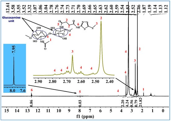 As reported previously in [34,35], the 1H-NMR spectrum of Chito showed three protons of N-acetyl glucosamine at chemical shifts of 1.93 ppm, and the signal at 3.18 ppm was ascribed to the H-2 proton of glucosamine residues. Also, the signals emanating from 3.25 to 4.00 ppm were attributed to the non-anomeric protons (H-3, 4, 5, and 6) and a signal of anomeric protons (H-1) of glucosamine residues was found at 4.66 ppm. In Figure 3, the 1H-NMR (500 MHz, DMSO-d6) of Chito-TZ, in contrast to CS, recorded a chemical shift of 2.66 ppm and 2.46 ppm, which were attributed to the protons of (SCH3) and two methylene units from the succinyl group, respectively. Furthermore, the singlet signal at 12.61 ppm was the chemical shift of N-H for (NH-CO). Also, as seen in Figure 3, it was demonstrated that 1,3,4-thiadiazol carboxylic acid was successfully grafted onto free amino groups of chitosan via the acylation reaction, as described by the appearance of a new singlet signal at 7.95 ppm, which was attributed to the resonance of the (N-H) proton, and the absence of the characteristic signal, which was related to the resonance of the hydroxyl unit at 12.56 ppm.