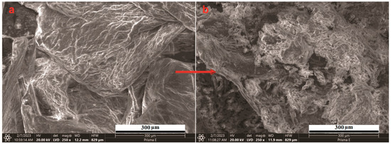 SEM images of Chito and Chito-TZ are presented in Figure 4. It was clearly observed that the surface morphology of chitosan changed after the modification reaction with the thiadiazole derivative. The surface of chitosan was smooth with minor wrinkles, but in contrast, Chito-TZ appeared with a different surface with high roughness. This change in chitosan surface was in accordance with previous reports [16,37] and was a result of the chemical modification reaction with methylthio-thiadiazolyl amino-4-oxobutanoic acid.