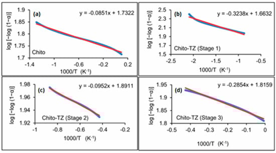 Broido’s (BR) kinetic plots of decomposition for Chito (a), Chito-TZ stage 1 (b), Chito-TZ stage 2 (c), and Chito-TZ stage 3 (d). Blue curves—Broido's plots, red lines—the best fit lines]