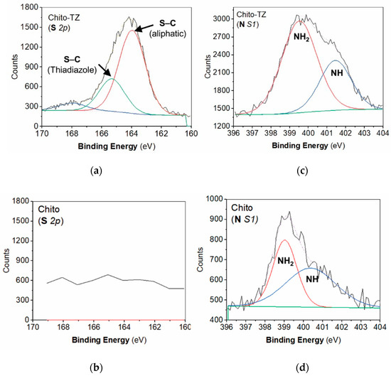 Sulfur (S 2p) for (a) Chito-TZ and (b) Chito; Nitrogen (N 1s) for (c) Chito-TZ and (d) Chito XPS spectra.