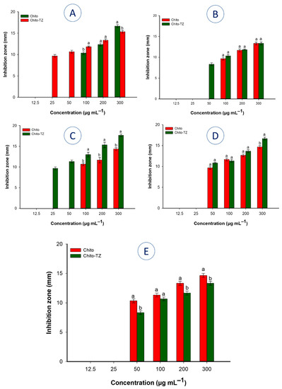 Antimicrobial activity of Chito and Chito-TZ against pathogenic Gram-positive bacteria, Gram-negative bacteria, and unicellular fungi. (A) is B. subtilis, (B) is S. aureus, (C) is P. aeruginosa, (D) is E. coli, and (E) is C. albicans. Different letters (a and b) on bars of Chito and Chito-TZ at the same concentration indicate that the mean values are significantly different (p ≤ 0.05) (n = 3).
