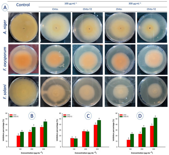 Antifungal activity of Chito and Chito-TZ towards phytopathogenic strains. (A) is the radial growth of phytopathogenic fungi grown on PDA supplemented with different concentrations of Chito and Chito-TZ compared to control, (B–D), are antifungal activity against A. niger, F. oxysporum, and F. solani, respectively. Different letters (a and b) on bars of Chito and Chito-TZ at the same concentration indicates that the mean values are significantly different (p ≤ 0.05) (n = 3).