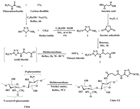This paper developed a novel chitosan conjugate with a 1,3,4-thiadiazole group using the method epitomized in Scheme 1. At first, the 1,3,4-thiadiazole derivative 1 was synthesized by cyclizing thiosemicarbazide with carbon disulfide in the presence of an anhydrous inorganic catalyst, such as anhydrous sodium carbonate (Na2CO3), under refluxing temperature for 6 h in pure ethanol, which was alkylated in ethanolic potassium hydroxide (alc. KOH) at room temperature with iodomethane (CH3I) for 4 h to give the S-methyl derivative 2, as portrayed in Scheme 1. Furthermore, acid derivative 3 was prepared by stirring compound 2 with succinic anhydride (C4H4O3) at room temperature for 3 h in benzene as a solvent, which was subjected to a chlorination reaction with thionyl chloride (SOCl2) to give the non-isolable intermediate (acid chloride), which was introduced into the skeleton of chitosan via coupling with the free primary amino groups of chitosan. Various spectral data were used to evaluate the newly synthesized compounds and chitosan conjugate, and each of the spectral results was compatible with the predicted structures.