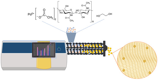 Extrusion also provides a platform for the synthesis of heterogeneous catalysts with tailored functionalities, where different precursors or additives are incorporated into each other during the (extrusion) process, to achieve nanocomposites and hybrid materials with improved mechanical strength and enhanced surface reactivity. Excellent examples have been described in the preparation of the supported metal nanoparticles used to catalyzed C-C bond forming and cross-coupling reactions via extrusion [25]. Among the most renowned strategies for C-C bond formation, the Suzuki-Miyaura cross-coupling reaction has gained significant attention in recent years for its environmentally friendly nature. The sustainability of the reaction can indeed be optimized through several key considerations. One approach is based on the use of green and renewable solvents such as water, ethanol, and bio-based derivatives or, alternatively, on solvent-less procedures. The latter, for instance, can be achieved through mechanochemical methods such as extrusion. Additionally, the design of recyclable and reusable heterogeneous catalysts can greatly reduce the carbon footprint of the reaction and improve the cost efficiency. Promising results have already been reported with cheap and non-toxic catalysts based on non-endangered metals such as nickel and copper [26,27,28,29,30]. However, Pd-based catalysts continue to be recognized as some of the most popular systems for the Suzuki-Miyaura cross-coupling [31,32,33,34]. Herein, a mechanochemical approach through extrusion was designed through the preparation of such catalytic materials by using palladium acetate as a metal precursor, ethylene glycol as a green reducing agent, and chitin for the synthesis of the catalyst support [35]. Chitin was selected not only for its natural abundance, but also for its high content of nitrogen, which made it an excellent candidate to produce N-doped carbons [36,37,38]. Notably, such (N-doped) carbons can serve as catalysts by themselves, for base-catalyzed reactions and/or facilitate the incorporation and dispersion of metal entities, mostly thanks to the presence of pyridinic surface groups.