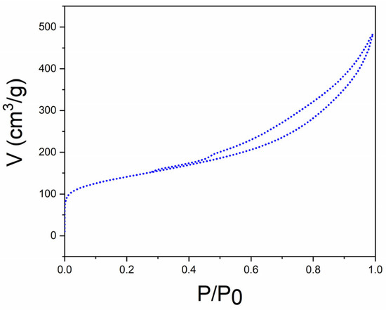 The two calcined samples with and without the base, which presented consistent and clearer Pd diffraction signals, were further characterized. The results are reported in Table 1. From the XRD diffraction patterns, metal particle sizes of (6.7 ± 0.5) and (9.7 ± 0.5) nm for Pd-chitin-500 and Pd-chitin-Na2CO3-500, respectively, were calculated using the Scherrer equation [48,49]. The palladium loading, determined by ICP-MS, was around 4 mg gcatalyst−1 for both samples. The textural properties including surface area, pore volume, and pore size were investigated by N2-physisorption. Figure 3 displays the result for Pd-chitin-500. A type IV isotherm and type II adsorption hysteresis were representative of the formation of a mesoporous material. The same held true for Pd-chitin-Na2CO3-500. Both samples exhibited a remarkably high surface area of 452–498 m2g−1, while the range of pore diameter (4.9–5.3 nm) further proved the occurrence of mesoporous solids.
