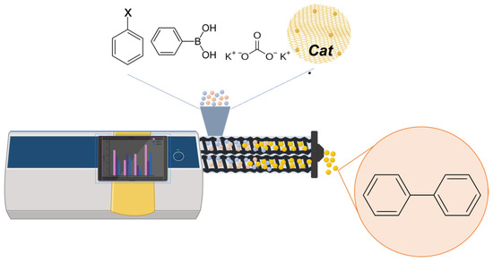 The Suzuki-Miyaura cross-coupling under mechanochemistry conditions based on extrusion.