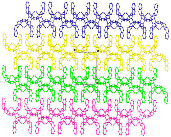 The crystal packing of 1 viewed on the ab plane. Different layers are depicted in different colours. H-atoms are omitted for clarity.
