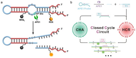- Lu, X.; Li, D.; Luo, Z.; Duan, Y. A dual-functional fluorescent biosensor based on enzyme-involved catalytic hairpin assembly for the detection of APE1 and miRNA-21. Analyst 2022, 147, 2834–2842. [Google Scholar] [CrossRef]