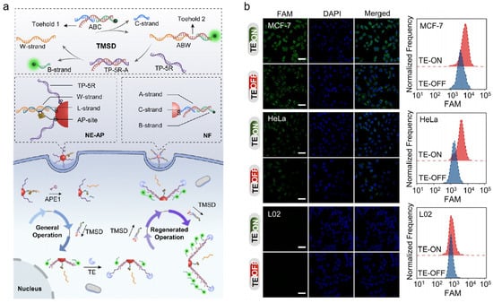 - Zhang, Q.; Wang, Y.; Wang, W.; Min, Q.; Zhang, J.R.; Zhu, J.J. A telomerase-assisted strategy for regeneration of DNA nanomachines in living cells. Angew. Chem. Int. Ed. 2023, 62, e202213884. [Google Scholar] [CrossRef]