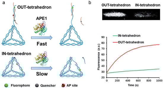 - Zhou, T.; Luo, R.; Li, Y.; Fan, J.; Hu, Y.; Tong, C.; Liu, B.; Li, D. Activity assay and intracellular imaging of APE1 assisted with tetrahedral DNA nanostructure modified-dnazyme and molecular beacon. Sens. Actuat. B-Chem. 2020, 317, 128203. [Google Scholar] [CrossRef]