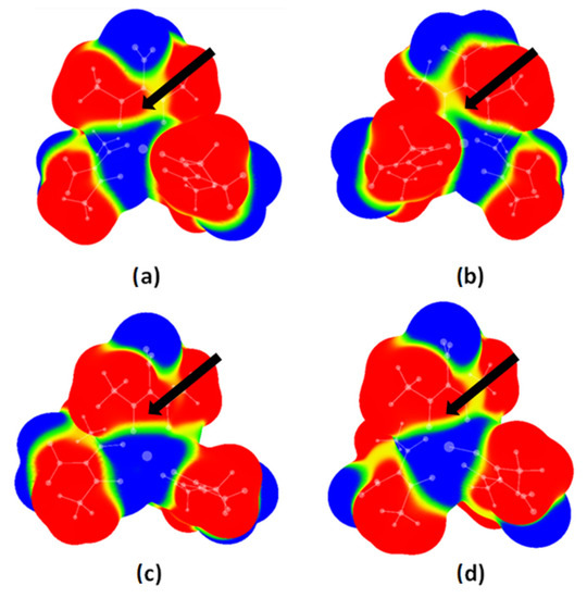 Electrostatic potential maps were calculated for all nitro-tris(acetylacetonato) complexes, and the results were analyzed to identify regions of strong positive electrostatic potential that may indicate the highly energetic properties of these molecules. Calculated electrostatic potential maps are given in Figure 3.