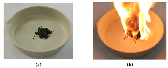Synthetized Co(AcAc-NO2)3 complex (a) before and (b) after initiation by an open flame.