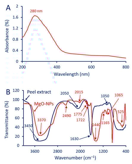 Under these optimum conditions, the presence of a maximum SPR at a wavelength of 280 nm (Figure 1A) revealed the absorption of light by the MgO-NPs at that specific wavelength. SPR occurs when the free electrons on the surface of NPs are excited by incident light. The observation of SPR is a critical factor confirming the successful formation and stability of MgO-NPs. The absorption peak at 280 nm suggests that the NPs in this study possessed unique optical properties related to their size, shape, and composition. The obtained results were in agreement with published data from the literature, which reported that the maximum SPR of MgO-NPs was in the range of 260–280 nm [28,29]. Also, the highest peaks for MgO-NPs synthesized using Tecoma stans (L.) were observed at 281 nm [30]. Prospective MgO-NP sizes are related to SPR, with smaller sizes being observed when SPR is positioned at shorter wavelengths (<300 nm) and larger sizes being found when SPR is located at longer wavelengths (>300 nm) [31].
