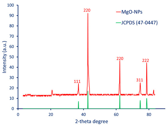 The crystalline nature and crystallographic structure of the MgO-NPs fabricated by the aqueous peel extract of pomegranate were analyzed by using XRD. As shown, five intense peaks, 111, 200, 221, 311, and 222, were observed at 2-theta degrees of 36.8°, 42.7°, 62.3°, 74.6°, and 78.7°, respectively (Figure 2). The peak positions at specific 2-theta degrees indicate the crystalline nature and crystallographic structure of the biosynthesized MgO-NPs according to the JCPDS file number 75-0447 [16]. Similarly, the XRD analysis of MgO-NPs fabricated by an aqueous extract of Rosa floribunda showed five intense peaks, 111, 200, 221, 311, and 222, at 2-theta degrees of 36.9°, 42.2°, 62.2°, 74.4°, and 78.5° [40]. Based on XRD analysis, the position and intensity of these peaks provide valuable information about the crystalline structure of the synthesized MgO-NPs. The presence of these sharp and intense peaks indicates that the plant-based MgO-NPs have a well-defined crystalline structure with distinct crystallographic orientations.