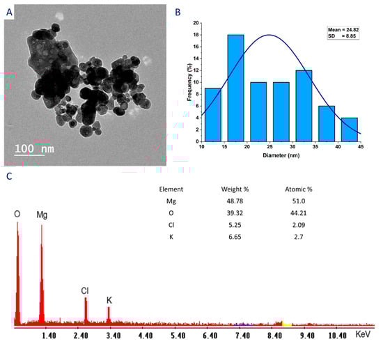 The size, shape, size distribution, and elemental composition of plant-synthesized MgO-NPs were investigated by TEM and EDX analysis. As shown, the aqueous extract of P. granatum has the efficacy in fabricating spherical-shaped and well-arranged NPs with sizes in the range of 10–45 nm and an average size of 24.82 ± 8.85 nm (Figure 3A,B). The determination of the size and shape of NPs is a critical factor affecting their activity. For instance, the inhibition percentages of Bacillus subtilis after being treated with MgO-NPs varies based on their sizes. In a study, the maximum inhibition percentage was 96.1% at a size of 35.9 nm and decreased to 94.5% and 75.7% at sizes of 47.3 and 2145.9 nm, respectively [42]. Also, the bacteriocidal efficacy of MgO-NPs against B. subtilis ATCC 9372 was at a percentage of 97.5% at size 26 nm and decreased to 93.1% at a size 69.1 nm. On the other hand, no significant difference has been noted between inhibition percentages (99.8–99.9%) of Staphylococcus aureus ATCC 6538 after treatment with different sizes (7.6, 14.4, 26, 35.9, 47.3, 56.3, and 69.1 nm) of MgO-NPs [43]. Therefore, due to the small size of synthesized MgO-NPs in the current study, we expect to have high biomedical activity.