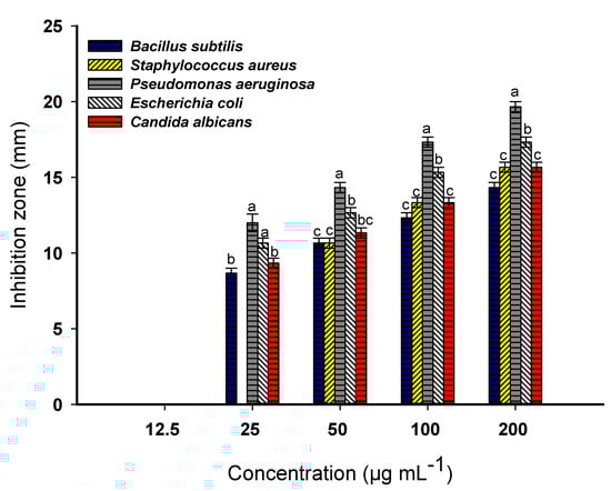Antimicrobial activity of plant-based MgO-NPs against Gram-positive bacteria, Gram-negative bacteria, and unicellular fungi. The different letters at the same concentration indicate that the data are statistically significant differences (p ≤ 0.05, n = 3, error bars are ±SD).