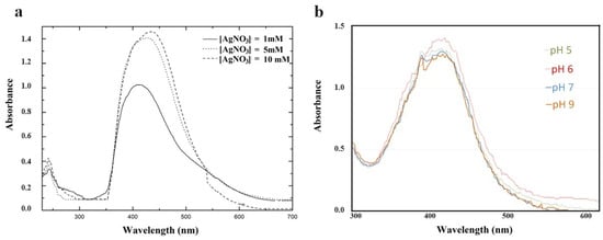 UV-vis spectra of AgNPs. (a) Synthesis reactions at different AgNO3 concentrations, showing the SPR band at 440 nm. (b) SPR at different pH levels.
